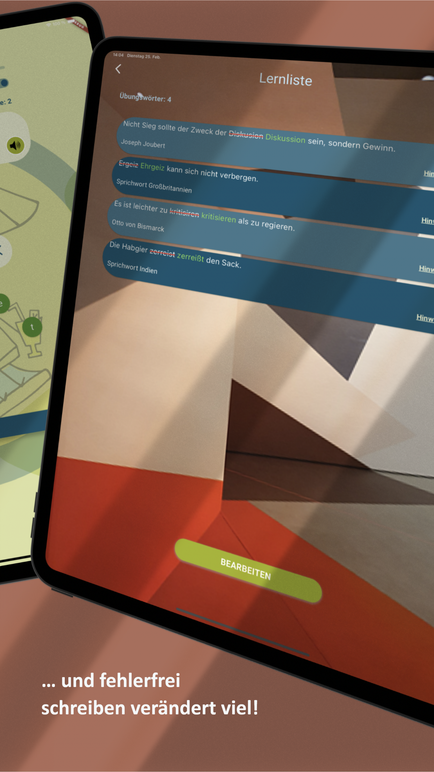 The Correct Spelling App offers effective spelling training through an integrative learning approach that combines listening, complete word writing, and meaningful sentence context. Featuring quotes and proverbs from Goethe, Schiller, Fontane, Kleist, and many other authors across cultures and eras, the app strengthens spelling, vocabulary, and memory. Short practice sessions, personalized error tracking, helpful explanations, and intelligent repetition algorithms ensure a long-term learning success.