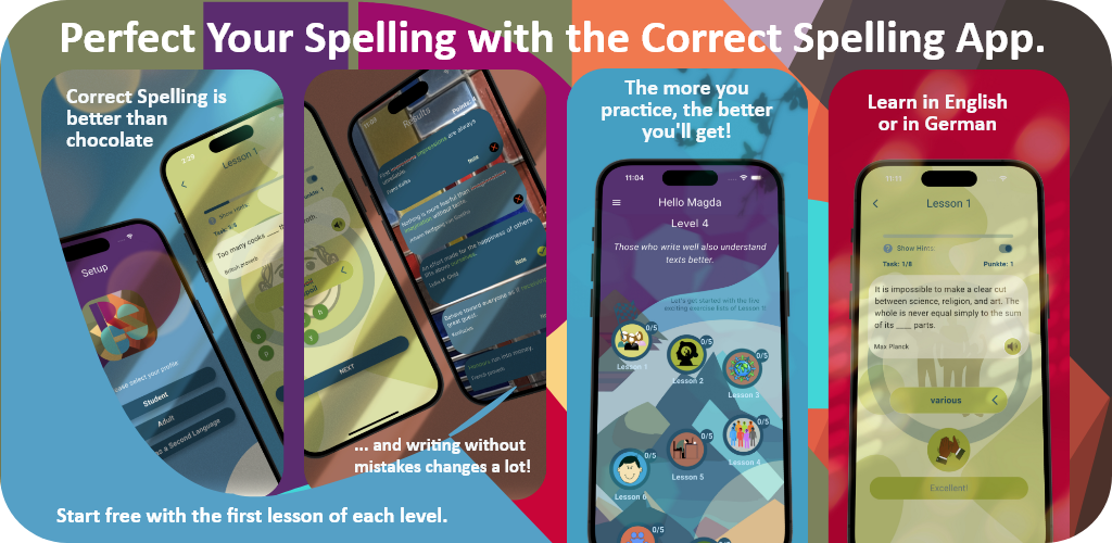Our app helps you improve your spelling in either German or English. Learn in a fun way and try it for free. Suitable for students (grades 3-13), adults, people with German or English as a second language, and senior citizens.